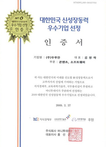 2009 대한민국 신성장동력 우수기업으로 선정되었습니다