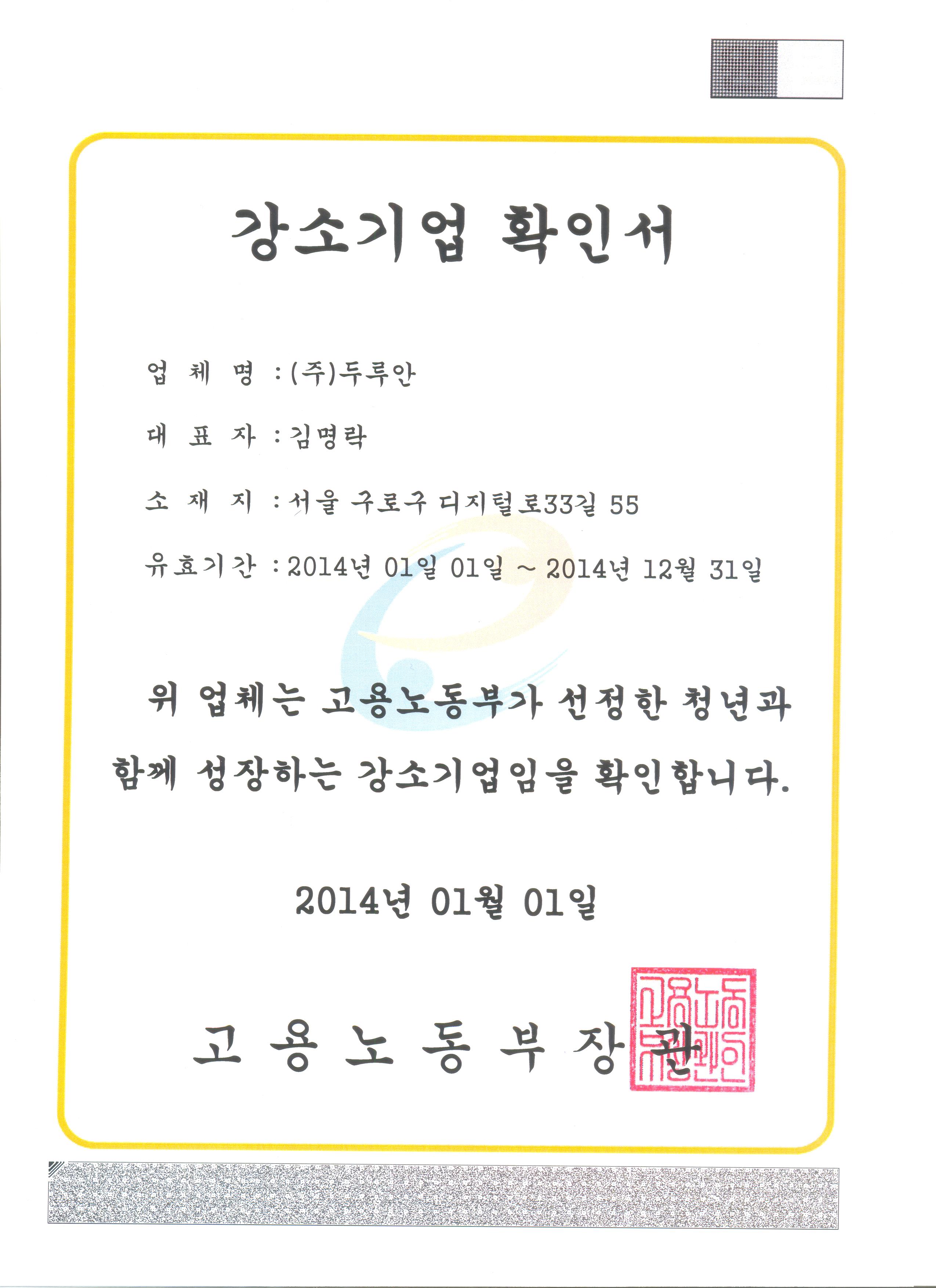 [공지] (주)두루안 2014년 강소기업 선정. <br> 당사는 청년과 함께 성장하는 강소기업으로 ... 보도일|2014.02.06 조회수|4194