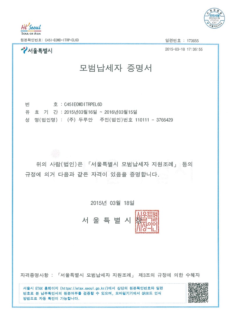 (주)두루안이 서울특별시에서 지정한 모범납세자에 선정되었습니다.