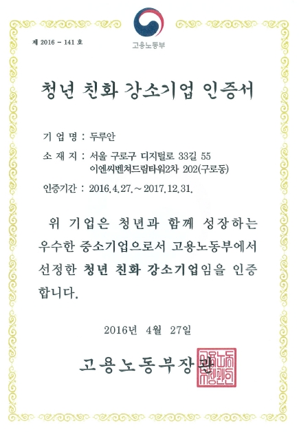 [공지]청년 친화 강소기업 선정 (2016.04.27 ~ 2017.12.31)