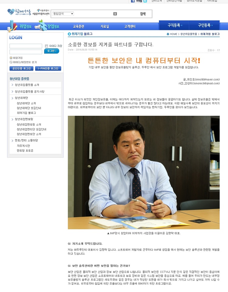 서울특별시 서울일자리플러스센터에서 진행한 일하기 좋은 우수기업으로 인터뷰했던 내용입니다.